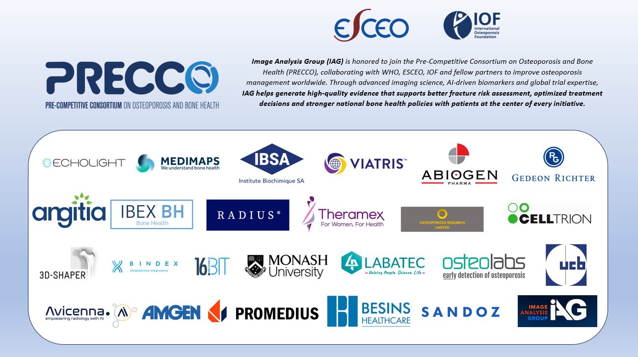 Image Analysis Group (IAG) joins PRECCO, the WHO–ESCEO–IOF consortium, to advance osteoporosis imaging and global bone health research in clinical trials through quantitative imaging, AI-driven biomarkers, and robust regulatory-ready endpoints.